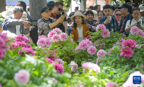 4月13日,游客在河南省洛陽市中國(guó)國(guó)花園內(nèi)賞牡丹花。(新華社發(fā) 張怡熙 攝)