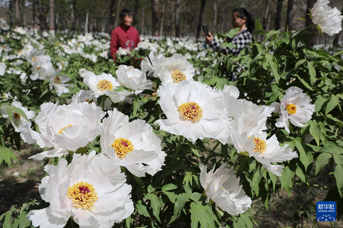 4月13日,游客在河南省焦作市溫縣國(guó)有實(shí)驗(yàn)林場(chǎng)芍藥花海中賞花拍照。(新華社發(fā) 徐宏星 攝)