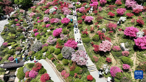 4月13日,游客在浙江省湖州市德清縣下渚湖奇幻谷杜鵑花海中漫步游玩(無人機(jī)照片)。(新華社發(fā) 謝尚國(guó) 攝)