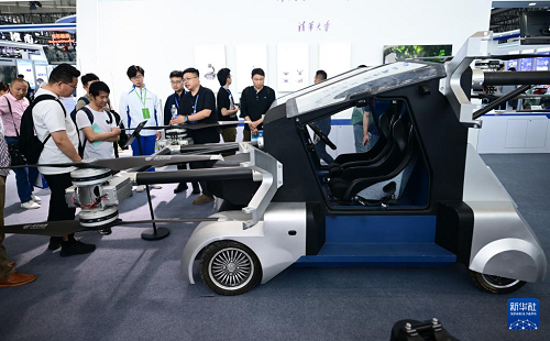 4月26日,觀眾在第三屆中國(安徽)科技創(chuàng)新成果轉化交易會上參觀一款飛行汽車。(新華社記者 周牧 攝)