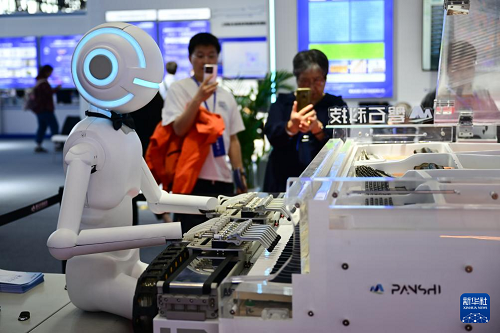 4月26日,觀眾在第三屆中國(安徽)科技創(chuàng)新成果轉化交易會上觀賞一款彈鋼琴的機器人。(新華社記者 周牧 攝)