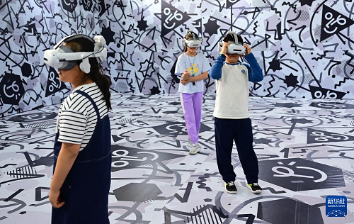 4月26日,小朋友們在第三屆中國(安徽)科技創(chuàng)新成果轉化交易會上體驗VR設備。(新華社記者 周牧 攝)