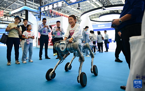 4月26日,小朋友在第三屆中國(安徽)科技創(chuàng)新成果轉化交易會上體驗一款機器狗。(新華社記者 周牧 攝)