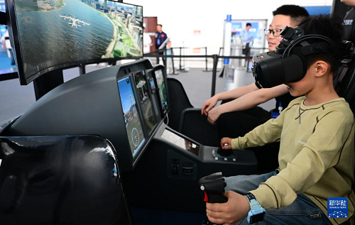 4月26日,小朋友在第三屆中國(安徽)科技創(chuàng)新成果轉化交易會上體驗一款駕駛艙模擬器。(新華社記者 周牧 攝)