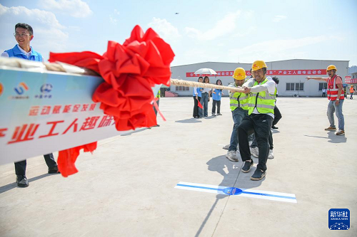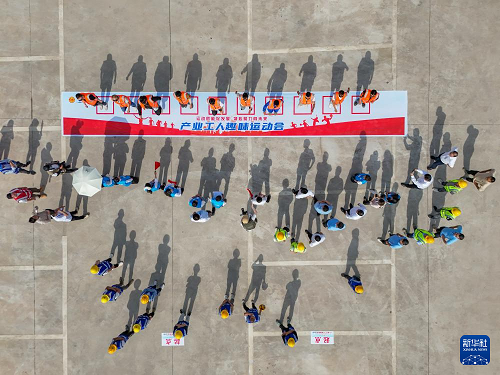 4月27日,工人們在進(jìn)行原地踏步60秒比賽活動(dòng)(無人機(jī)照片)。(新華社記者 王曦 攝)