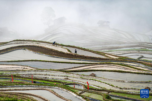 4月28日,村民在貴州省從江縣加榜梯田查看稻田蓄水情況。(新華社記者 楊文斌 攝)