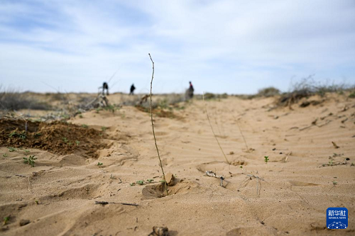 4月28日,在杭錦旗境內(nèi)的庫布其沙漠,治沙工人在栽種沙柳。(新華社記者 李志鵬 攝)