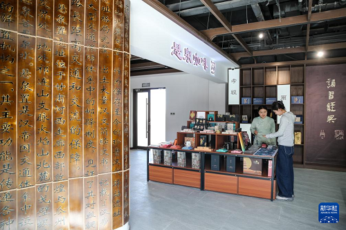 4月29日,游客在懸泉置遺址景區(qū)挑選文創(chuàng)產(chǎn)品。(新華社記者 郎兵兵 攝)