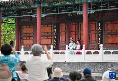 5月5日,演員在天津人民公園為觀眾表演京劇《西廂記》。(新華社記者 孫凡越 攝)