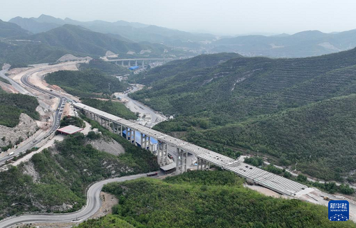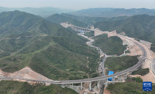 5月7日拍攝的石太高速公路改擴(kuò)建項(xiàng)目核桃園4號(hào)橋建設(shè)工地施工現(xiàn)場(chǎng)(無(wú)人機(jī)照片)。(新華社記者 楊世堯 攝)