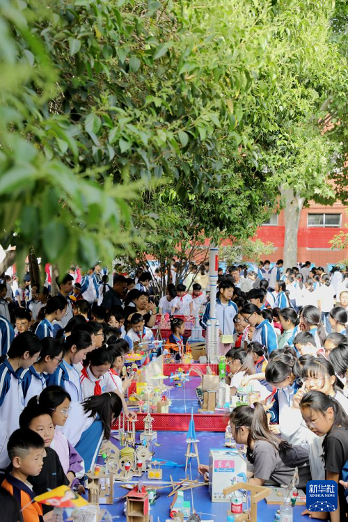 5月7日,在河南省濟源市軹城鎮(zhèn)校園科技節(jié)活動上,同學(xué)們在參觀科技小制作。(新華社發(fā) 段二平 攝)