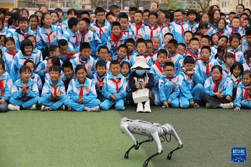 5月7日,甘肅省定西市安定區(qū)東關(guān)小學(xué)的學(xué)生在觀看機器狗表演。(新華社發(fā) 王克賢 攝)