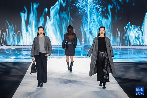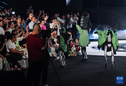 5月7日,在古鎮(zhèn)音樂時裝秀現(xiàn)場,人形機(jī)器人與觀眾互動。(新華社記者 徐昱 攝)