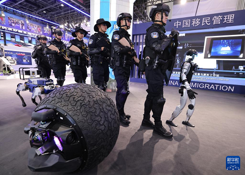 5月14日,在第十二屆中國國際警用裝備博覽會移民管理裝備展區(qū),民警和球形機(jī)器人、警用機(jī)器狗和具身人形智能警務(wù)機(jī)器人(右一)一起進(jìn)行巡邏演練。(新華社記者 殷剛 攝)
