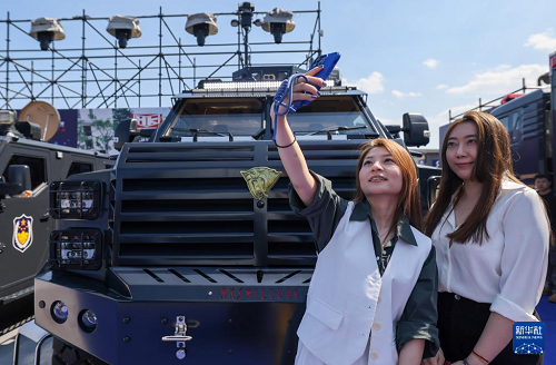 5月14日,在第十二屆中國國際警用裝備博覽會上,觀眾在警用車前自拍留影。(新華社記者 殷剛 攝)