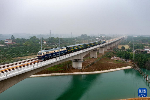 5月15日,55103次檢測(cè)列車(chē)在對(duì)滬渝蓉高鐵武宜段進(jìn)行綜合測(cè)試(無(wú)人機(jī)照片)。(新華社發(fā) 李垚駿 攝)