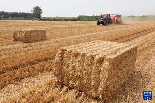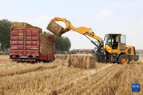 6月18日,河北石家莊晉州市周家莊鄉(xiāng)北捏盤村農(nóng)戶在麥田里將打包好的秸稈裝車。(新華社發(fā) 梁子棟 攝)