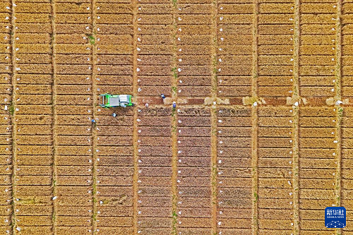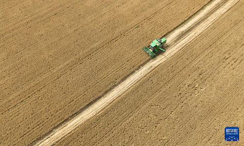 6月18日,河北石家莊晉州市周家莊鄉(xiāng)北捏盤村農(nóng)戶駕駛聯(lián)合收割機(jī)收割小麥(無人機(jī)照片)。(新華社發(fā) 梁子棟 攝)