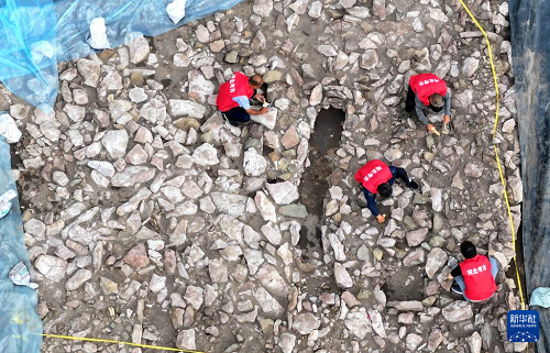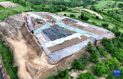6月18日,宣化鄭家溝遺址考古發(fā)掘項(xiàng)目隊(duì)員在一號(hào)積石冢工作(無人機(jī)照片)。(新華社記者 王曉 攝)