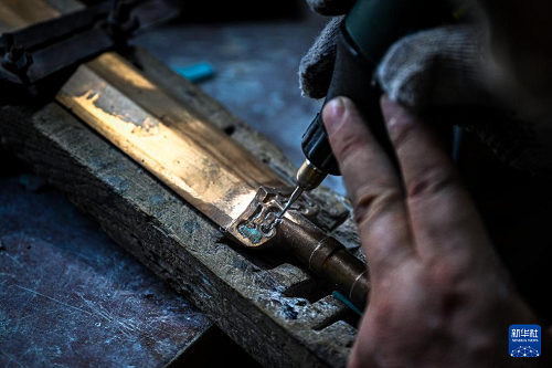 6月16日,在荊州市公安縣埠河鎮(zhèn),敖興華在工作坊內(nèi)鑲嵌劍格。(新華社記者 杜子璇 攝)