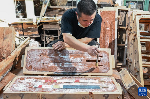 6月24日,在荊州市公安縣埠河鎮(zhèn)的工作坊內(nèi),敖興華在雕刻用來(lái)制作模具花紋的花板。(新華社記者 杜子璇 攝)