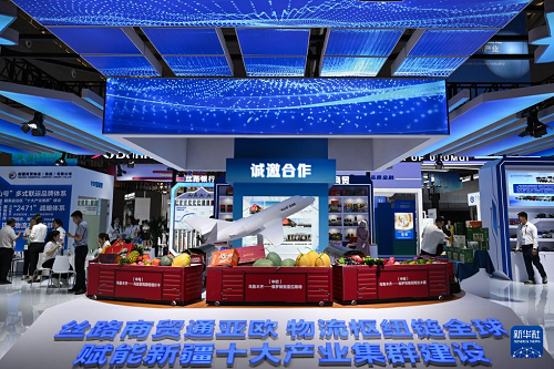 6月26日,在2025(中國(guó))亞歐商品貿(mào)易博覽會(huì)現(xiàn)代物流、低空經(jīng)濟(jì)展區(qū),新疆商貿(mào)物流(集團(tuán))有限公司展臺(tái)展示多條跨境物流項(xiàng)目。(新華社記者 辛悅衛(wèi) 攝)