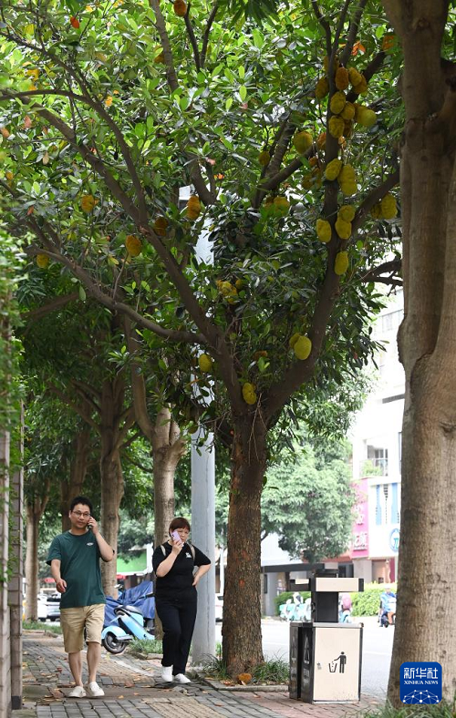 6月29日,在南寧市金浦路,市民從木菠蘿樹(shù)下經(jīng)過(guò)。(新華社記者 陸波岸 攝)