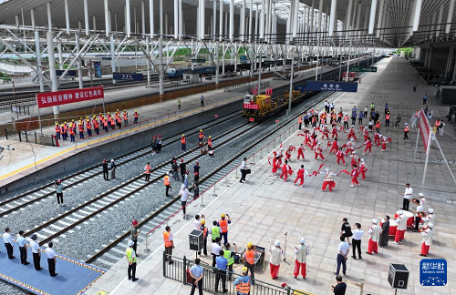 7月1日在延安站拍攝的西延高鐵軌道貫通儀式(無(wú)人機(jī)照片)。(新華社記者 張博文 攝)