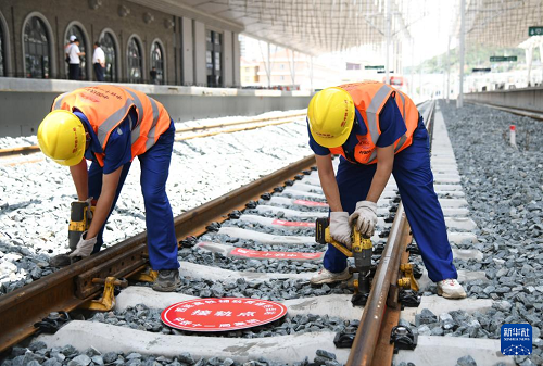 7月1日,中鐵十一局工人在延安站施工。(新華社記者 張博文 攝)
