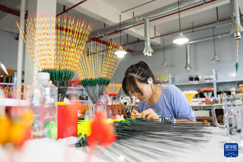 7月1日,在位于臨湘市浮標(biāo)小鎮(zhèn)的湖南天野釣具有限公司生產(chǎn)車間,工人在生產(chǎn)浮標(biāo)。(新華社記者 陳思汗 攝)