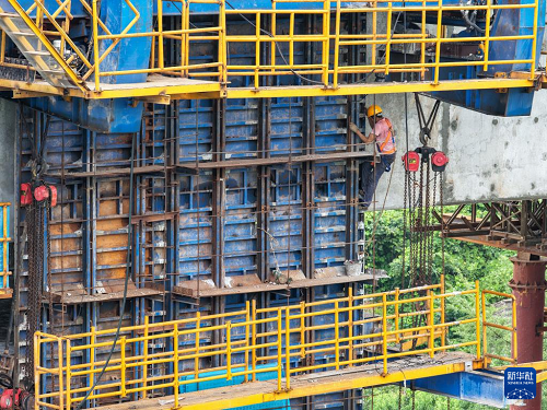 7月8日,工人在成渝中線高鐵土橋樞紐互通雙線特大橋建設(shè)現(xiàn)場(chǎng)施工作業(yè)。(新華社記者 唐奕 攝)