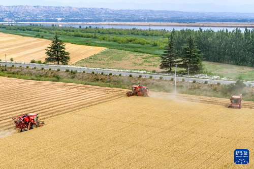 6月9日,河南省三門峽靈寶市西閻鄉(xiāng)東古驛村村民在搶收小麥(無人機照片)。(新華社發(fā) 杜杰 攝)