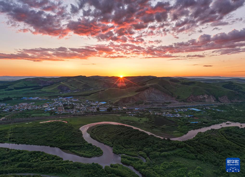 這是7月11日在內(nèi)蒙古免渡河國家濕地公園拍攝的日出景色(無人機(jī)照片)。(新華社記者 馬金瑞 攝)