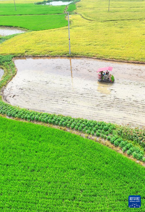7月13日,湖南省衡陽市衡東縣霞流鎮(zhèn)農(nóng)民駕駛農(nóng)機進行晚稻插秧工作(無人機照片)。(新華社發(fā) 曹正平 攝)