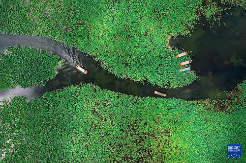 7月16日,游客在普者黑景區(qū)內(nèi)乘船游覽(無人機(jī)照片)。(新華社發(fā) 彭奕凱 攝)