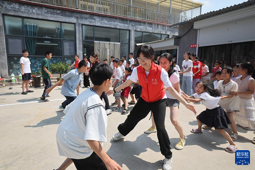 7月17日,在山東省臨沂市沂南縣辛集鎮(zhèn)彭家莊村開辦的暑期公益課堂上,來自山東財(cái)經(jīng)大學(xué)蒲公英支教團(tuán)的大學(xué)生志愿者和孩子們一起玩“老鷹捉小雞”游戲。新華社發(fā)(王彥冰 攝)