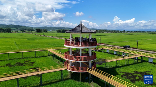 7月18日,游客在吉林省和龍市光東村的稻田觀光塔中游覽(無人機(jī)照片)。(新華社記者 邵澤東 攝)