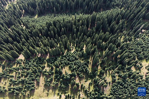 這是8月2日在庫爾德寧拍攝的雪嶺云杉(無人機照片)。(新華社記者 趙宇思 攝)