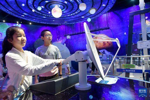 8月2日,小朋友在山東省棗莊市科技館參觀。(新華社發(fā) 劉明祥 攝)