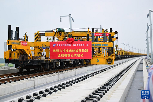 8月6日,在淮宿蚌城際鐵路鋪軌施工現(xiàn)場,中鐵一局施工人員將首對500米長鋼軌鋪設在無砟軌道上,這標志著淮宿蚌城際鐵路全線開始鋪軌。