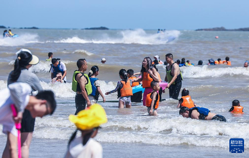 8月12日,游客在朱家尖南沙景區(qū)嬉水。(新華社記者 徐昱 攝)
