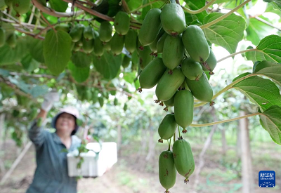 8月12日,果農在河北省盧龍縣劉田各莊鎮(zhèn)張?zhí)锔髑f村軟棗獼猴桃種植基地采摘軟棗獼猴桃。(新華社記者 楊世堯 攝)
