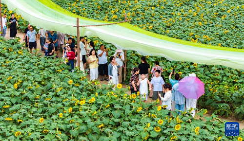 8月12日,游客在河南省駐馬店市西平縣老王坡產(chǎn)業(yè)融合發(fā)展示范區(qū)的百畝油葵花海游玩。(新華社發(fā) 趙永濤 攝)