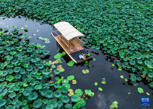 8月13日,游客在江蘇省興化市萬(wàn)畝荷塘景區(qū)賞荷游玩(無(wú)人機(jī)照片)。(新華社發(fā) 周社根 攝)