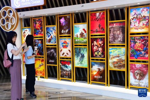 8月17日,觀眾在江蘇省無錫市一家影城的電影海報前駐足。(新華社發(fā) 還月亮 攝)