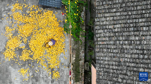 8月18日,猛董村村民在晾曬玉米(無(wú)人機(jī)照片)。(新華社發(fā) 胡程 攝)