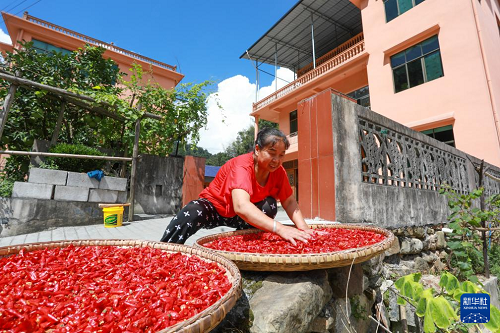 8月18日,猛董村村民在晾曬辣椒。(新華社發(fā) 胡程 攝)