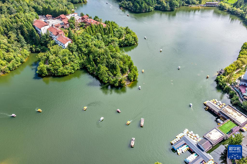 8月21日,游客在黃水鎮(zhèn)月亮湖景區(qū)泛舟游玩(無人機照片)。(新華社記者 唐奕 攝)