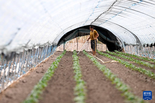 8月26日,在和縣歷陽鎮(zhèn)太平村,菜農(nóng)給辣椒秧苗澆水。(新華社記者 黃博涵 攝)