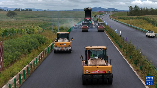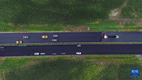8月28日,在鐵科高速公路延壽縣至尚志界段主線,大型機(jī)械設(shè)備在進(jìn)行瀝青攤鋪收尾作業(yè)(無人機(jī)照片)。(新華社記者 王松 攝)